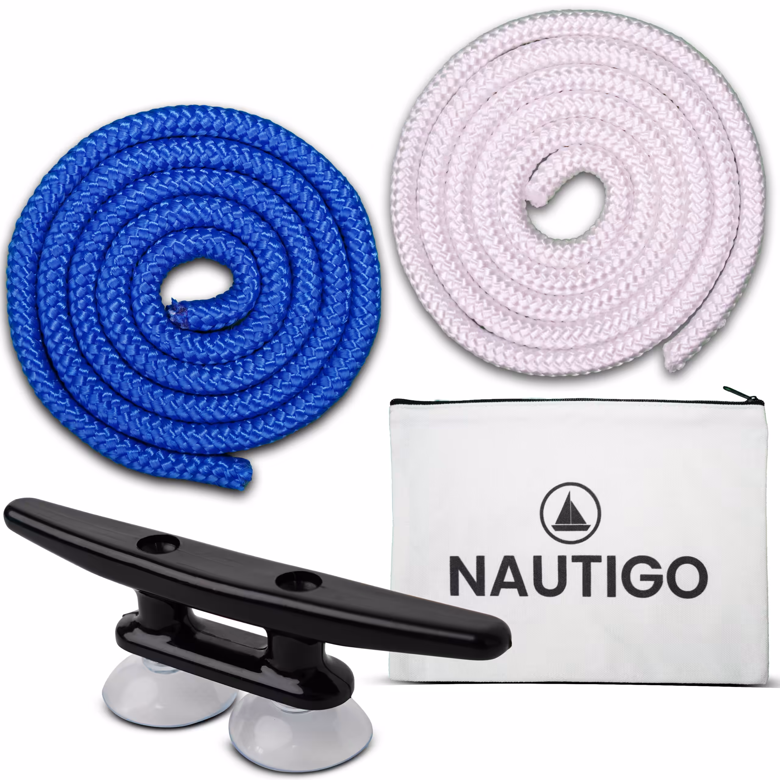 Set in Beutel mit 2x 1,2m Tampen unterschiedlich dick und Klampe mit Saugnäpfen